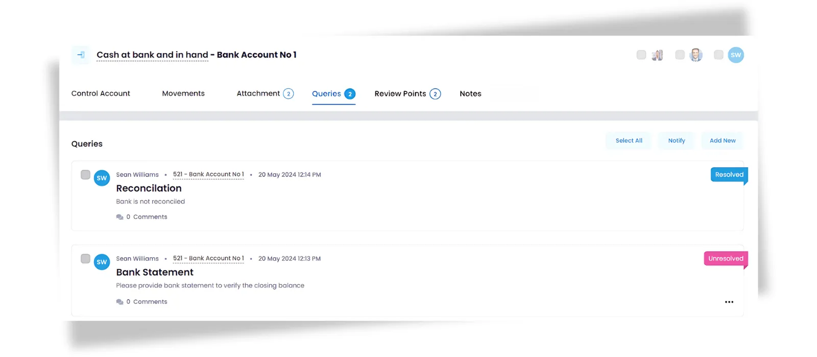 The user gets an option to write Notes and Queries related to a particular control account. Users can also reply back to the queries raised. This ensures clear communication between the preparer, reviewer and partner.